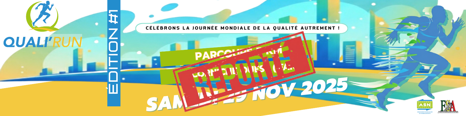 Suite à des contraintes indépendantes de notre volonté, l’ASN et la FSA ont pris la décision de reporter l’événement QUALI'RUN, initialement prévu ce samedi 29 novembre 2025, à une date ultérieure.